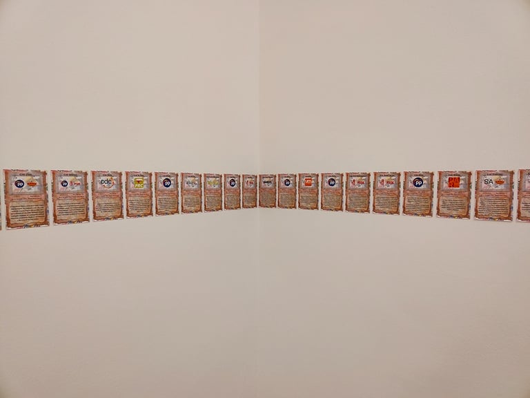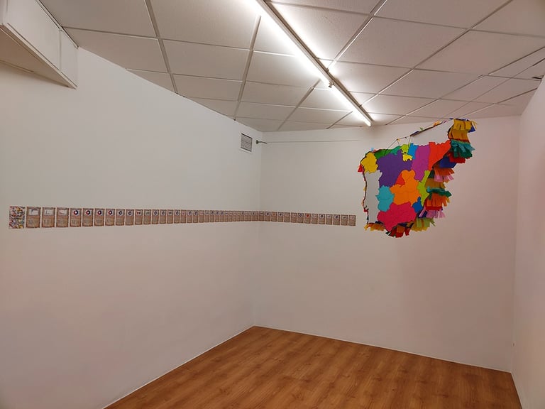 La instalación esta formada por 47 cartas distribuidas por la pared y la piñata de España.