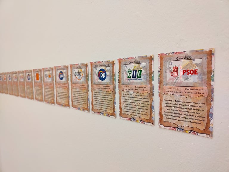 The project presents a piñata in the shape of Spain filled with chocolate coins and replicas of role playing cards, with statistics and data on Spanish corruption, parties involved, stolen money, the year of the events and the people charged in each case.