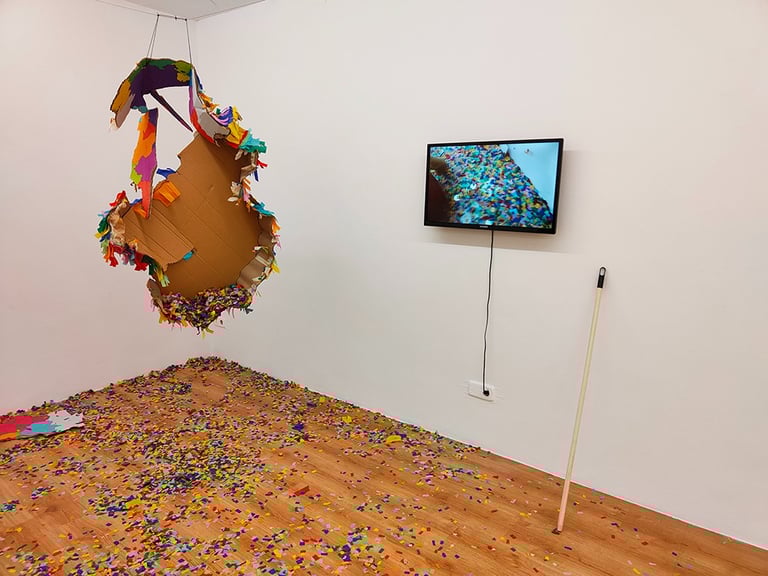 La piñata fue destruida con un palo de escoba el día de la inauguración, quedando rota hasta que finalizo la exposición.
