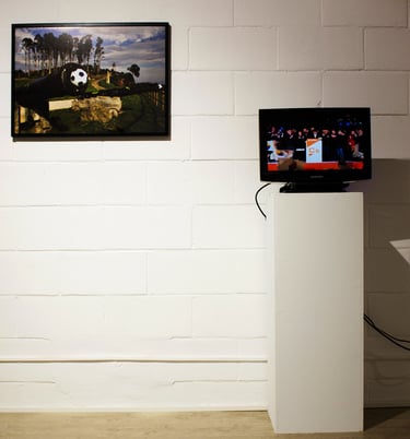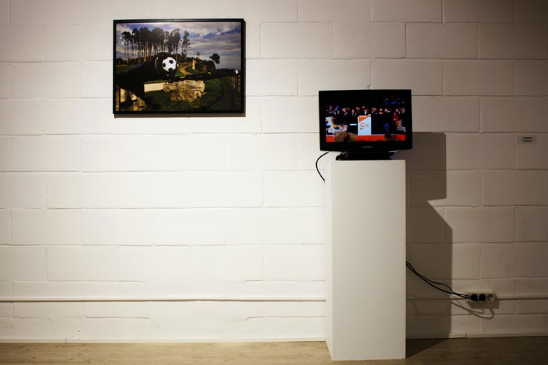 Having witnessed economic ruin, how do you keep the population from rebelling? DosJotas responds to this question with Bombas de Humo/ Smoke Pumps (2017). The artwork documents an action carried out in Asturias where the artist placed soccer balls in the mouths of old bronze cannons, symbolizing the power of Soccer as an instrument for the mastery of the passions and of catharsis of the increasingly hopeless masses. The images are accompanied by a video of election celebrations and rallies of both new and old political parties, all a hymn to the restoration of the regime after the brief pause caused by the unsuccessful 15M.