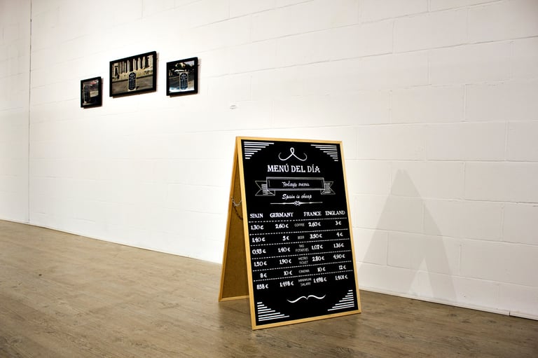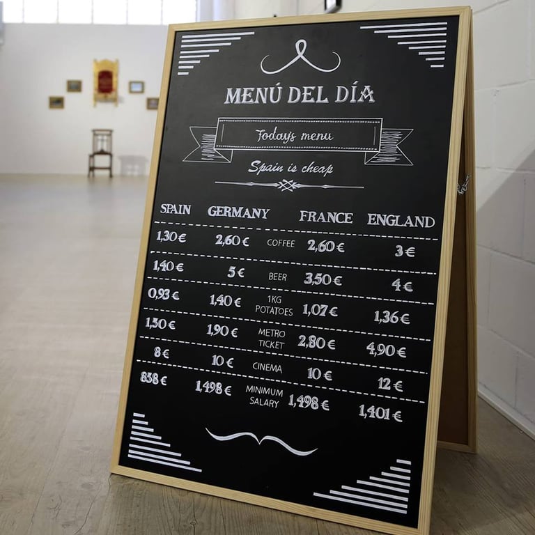 This atmosphere of the “country for sale” through the exploitation of its clichés, exporter of cheap qualified labor, and the creator of underemployed people in at home, is made explicit in the artwork, Menu of the Day/Daily Specials (2018). This creation consists of the realization of a blackboard that imitates those used by tapas bars to announce their specials to passers-by. On the blackboard, instead of the menu, is a comparative table of the average prices for a cup of coffee, a beer, a kilo of potatoes, a subway ticket, a cinema ticket and the minimum salary in various European countries – Spain, France, Germany and England.