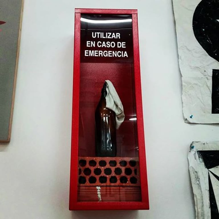Use in case of emergency, action carried out in Madrid where the artist places this phrase in different utensils found in the street that can be used against the police in a demonstration, in the room he presents the documentation of the action next to a fire extinguisher box, with the phrase use in case of emergency, in the box instead of a fire extinguisher we can find a Molotov cocktail and a brick.