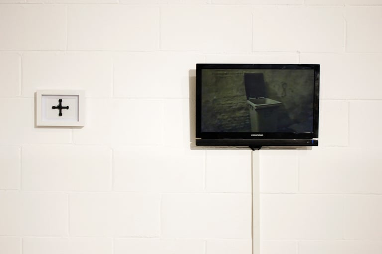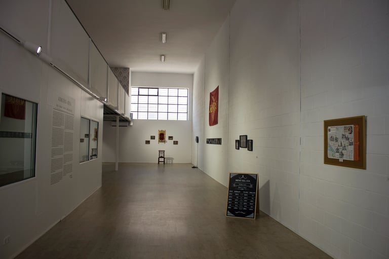 Continuing with the reflection on the idea of ‘Whose street is it, anyway?’, the artist presents the work, Altar Contemporáneo/Contemporary Altar (2018). In this work, DosJotas presents an altar that imitates the multitude of altars that populate the Guadalquivir metropolis and in which the central saint has been replaced by the text of Article 16 of our Constitution. Article 16 refers to ideological and religious freedom. In this way, he jokes ironically about the state of the supposed secularism of the city government that recently took the activists of the group, Coño Insumiso (Innocent Pussy) to trial. In the gallery, the installation is accompanied by the documentation of Capirotes (Hoods) action (2018), in which the artist installed the omnipresent Nazarene hoods on different street bollards.