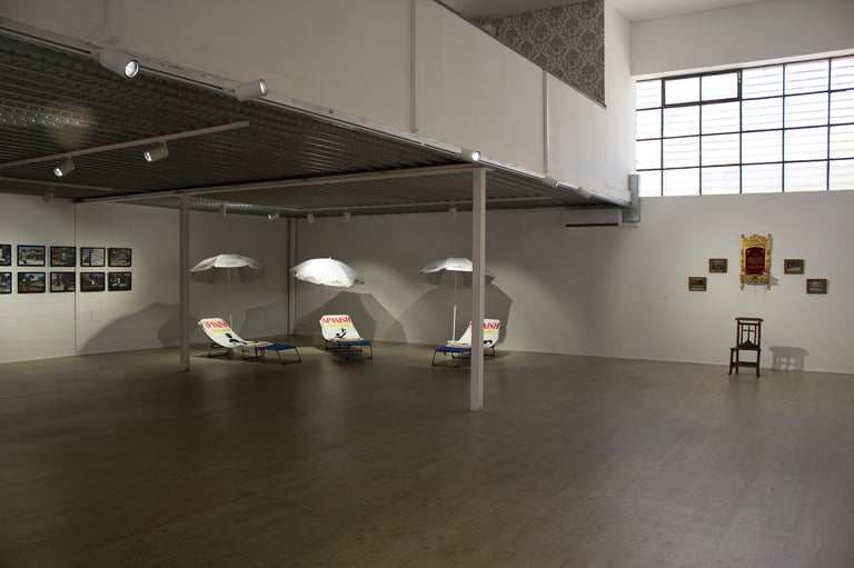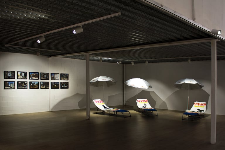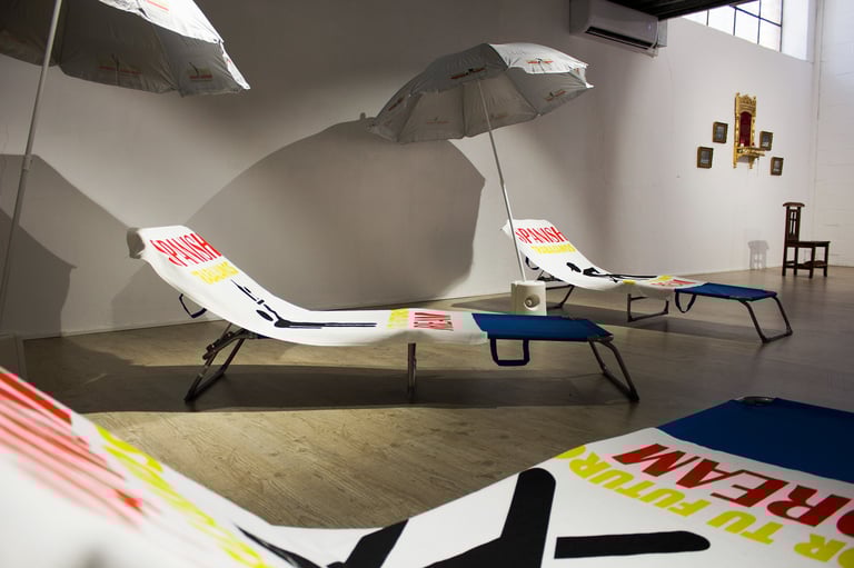 If until now tourism and the city’s dedication to the generation of economic value have been the focus of the exhibition Topical Actions – Atopic, the artwork Spanish Dream (2017) reflects upon how these phenomena influence the working class, in particular the youth who during the last decade have tried to join the labor market. Spanish Dream, made and exhibited for the first time in Cartagena during the Festival Mucho Más Mayo within the program (Re)lecturas, is organized along two axes: the emigration of the population in search of better opportunities and tourism or construction as the only careers really accepted. Here, at 13ESPACIOarte, DosJotas exhibits photographic documentation of the project – which consisted of the creation of objects such as towels with logos and advertising marquees with slogans – along with the installation of a storefront in the form of a beach shop that incorporated these objects.