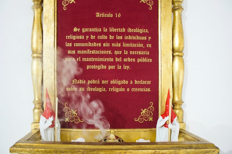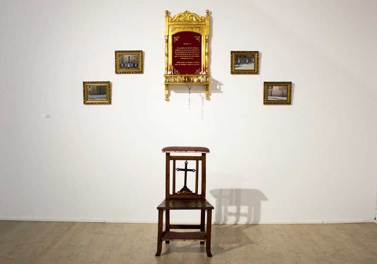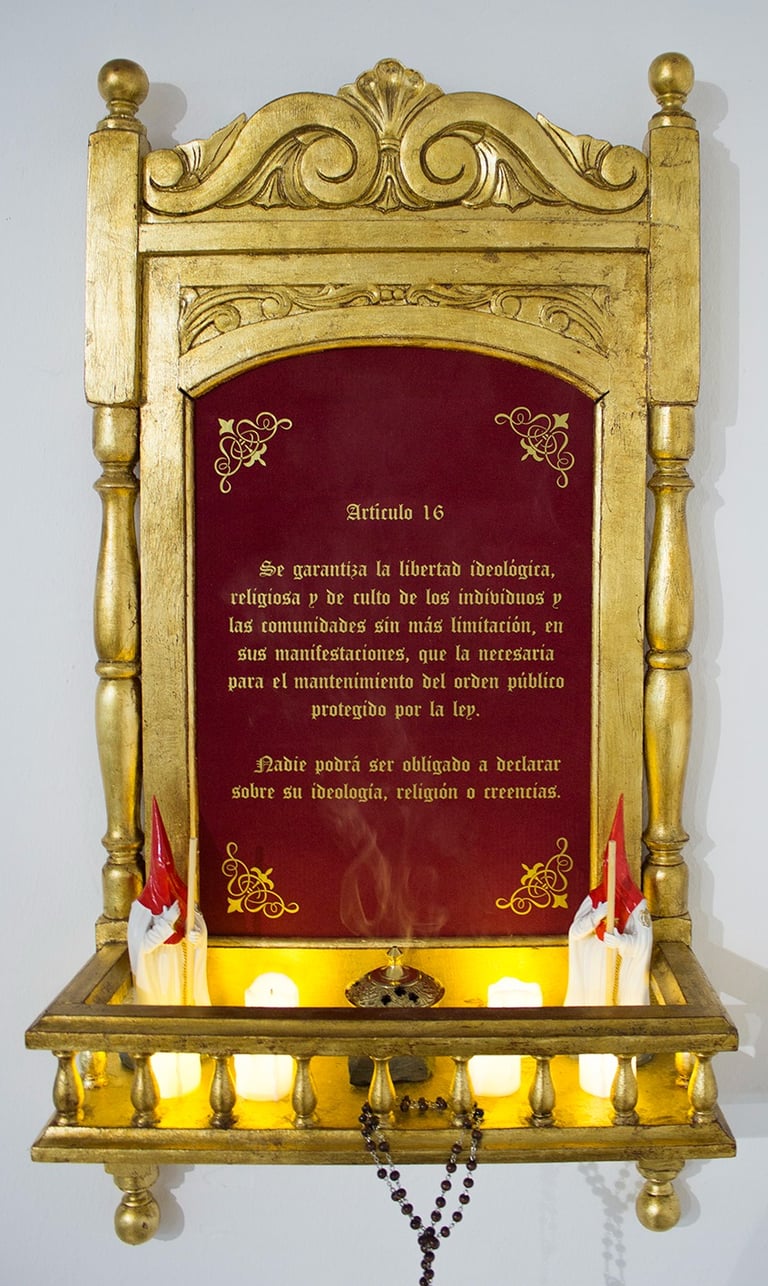 Continuando la reflexión sobre ‘¿de quién es la calle?’ el artista presenta la pieza Altar Contemporáneo (2018). En esta obra DosJotas nos muestra un altar a imitación de los tantos que pueblan la metrópolis del Guadalquivir y donde el santo central ha sido sustituido por el texto del Artículo 16 de nuestra Constitución, el que se refiere a la libertad ideológica y de culto. De esta forma ironiza sobre la supuesta laicidad del estado en la urbe que recientemente llevó a juicio a las activistas del Coño Insumiso. En la galería, esta instalación se acompaña por la documentación de la acción Capirotes (2018), durante la cual el artista instaló el omnipresente capirote de nazareno en diferentes bolardos callejeros.