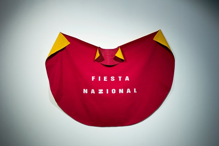 Sevilla, circuito de ocio para turistas, ciudad perezosa y dedicada la contemplación de su propio ombligo es también una de las principales sedes de la Fiesta Nacional: la tauromaquia. Especialmente durante la Feria de Abril, cuando la Maestranza ofrece sus mejores galas a propios y extraños. En opinión de DosJotas esta fiesta, devenida en arquetipo por excelencia de lo español, es representativa de lo más retrógrado de nuestra cultura, y así lo deja de manifiesto en su pieza Fiesta Nazional (2018) en la que interviene un capote escribiendo sobre él el título de la pieza.