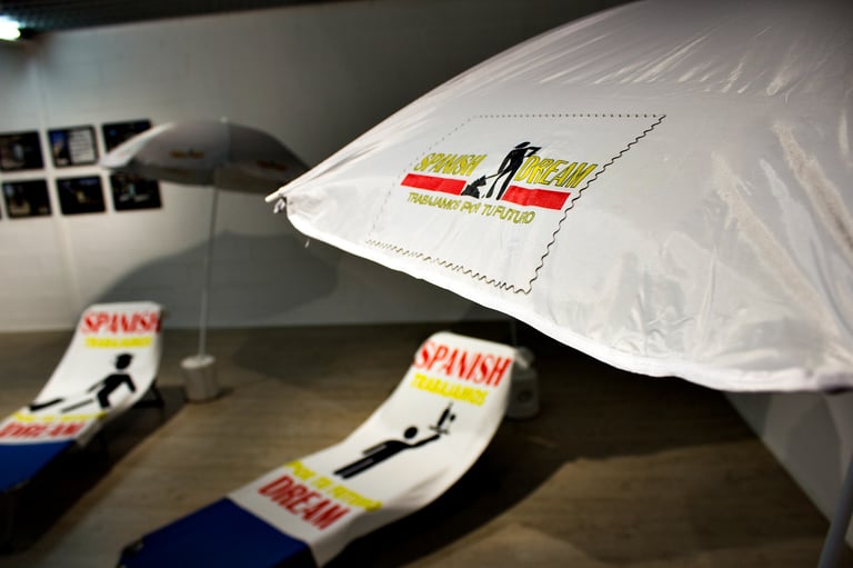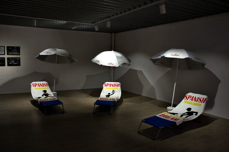 Si hasta ahora el turismo y la dedicación de la ciudad a la generación de valor de cambio han centrado la exhibición Acciones Tópicas – Atópicas, en Spanish Dream (2017) reflexiona sobre cómo estos fenómenos influyen en la clase obrera, en concreto en las generaciones más jóvenes que durante la última década han intentado incorporarse al mercado de trabajo. La pieza, realizada y expuesta por primera vez en Cartagena durante el Festival Mucho Más Mayo dentro del programa (Re)lecturas, se organiza en dos ejes: la emigración de la población en busca de mejores oportunidades y el turismo o el ladrillo como únicas carreras realmente toleradas. Aquí, en 13ESPACIOarte expone la documentación fotográfica del proyecto – que consistió en la creación de objeto como toallas con logotipos y la instalación de eslóganes en marquesinas publicitarias -, junto con la instalación de un escaparate con los objetos creados a modo de tienda playera.