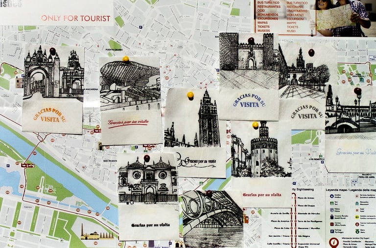 In Seville, the primary economic engine is the sale of historical monuments turned into fetishes along with the hotel trade. This union, whose fruit is low skilled jobs and the gentrification of the city center, is the theme of the artwork, Thank you for your Visit (2018). For the artwork, the artist uses napkins taken from bars and places them on a map of the city. The napkins hide the drawings of monumental enclaves.
