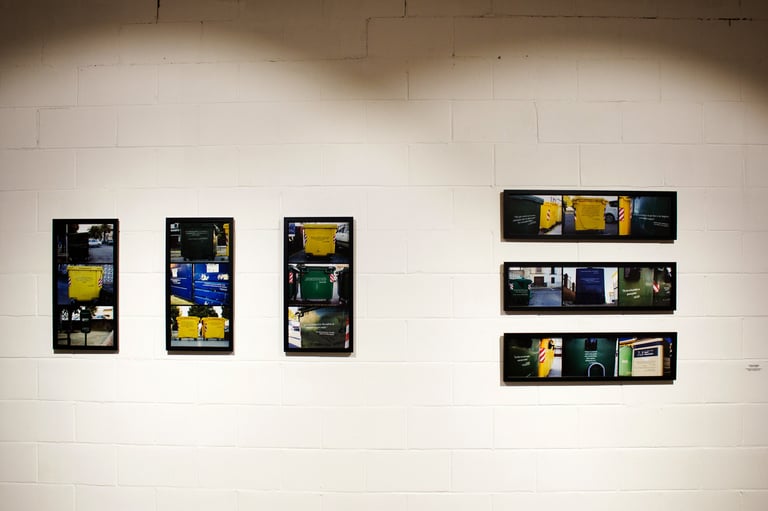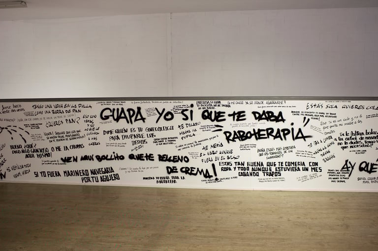 In Estado Patriarcal/ Patriarchal State (2015) the artist turns his gaze towards another pillar of societal oppression: patriarchy. This action was carried out in La Rambla, Córdoba, during the International Day against Gender Violence. It consisted of the inscription of sexist phrases spewed by our politicians on garbage containers. In the exhibition, the photographs of the intervention are shown in a grid surrounded by daily catcalls that women continue to suffer in the streets of our cities.