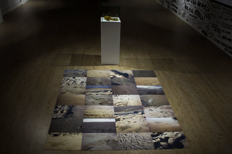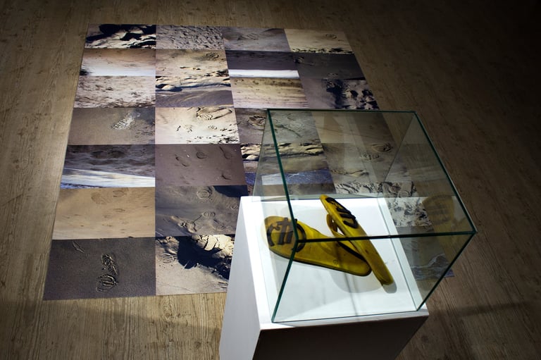 As a culmination to the exhibition at 13ESPACIOarte we find the piece Huellas Económicas/Economic Footprints (2016), an action of great poetic force executed in different parts of the Spanish coast. The project consisted of the creation of flip flops that imprinted the sand with the euro symbol when used to walk on the beach. The sea, a historical place of transit, of cultural exchanges, a generator of life … is transformed today into a mere leisure space and dumping ground for the greater glory of the tyranny of the merchandise; that consumes marine life in the plastic holocaust and squanders human existence on boats made of sticks.