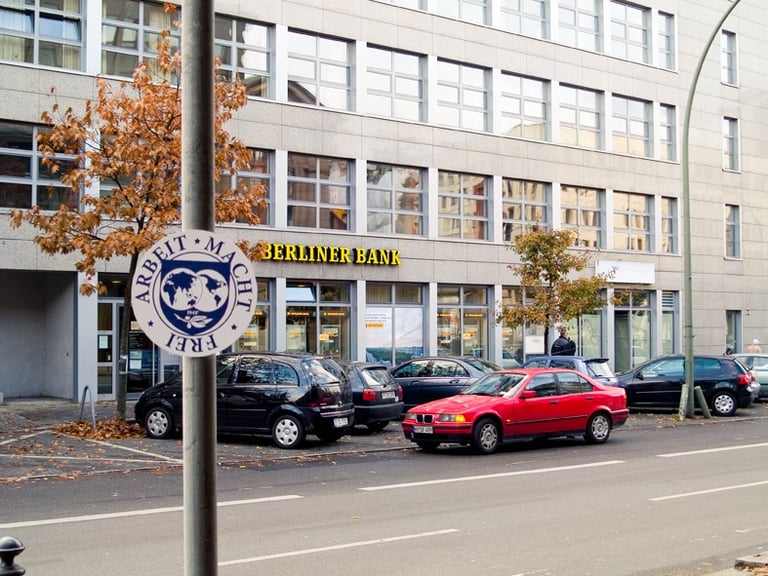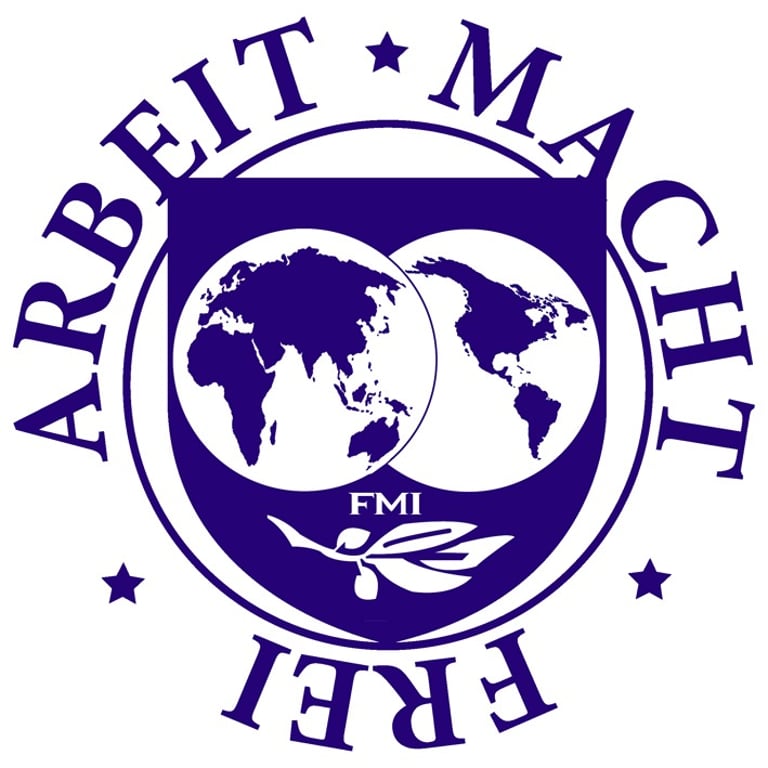 The phrase "Arbeit macht frei" (work will set you free), cruel slogan that was placed at the entrances of many Nazi concentration camps, is decontextualized and integrated into existing economic structures by the ownership of the logo of the IMF (International Monetary Fund ).