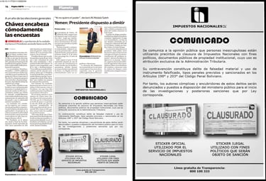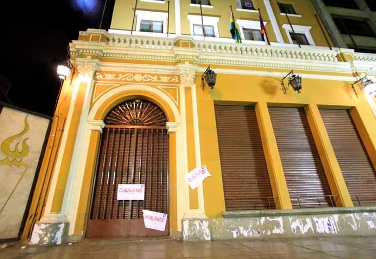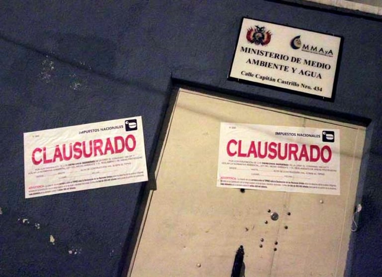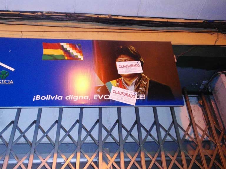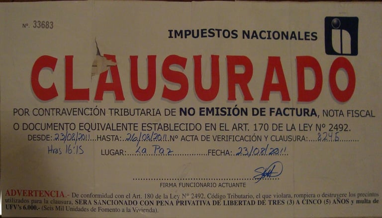 “Impuestos Nacionales” de Bolivia hace un comunicado contra la intervención "Clausurado" acusando de: “delito de falsedad material y uso de instrumento falsificado”, por lo que “los autores, cómplices y encubridores serán denunciados y puestos a disposición del ministerio público para el inicio de investigaciones y sanciones por ley”.