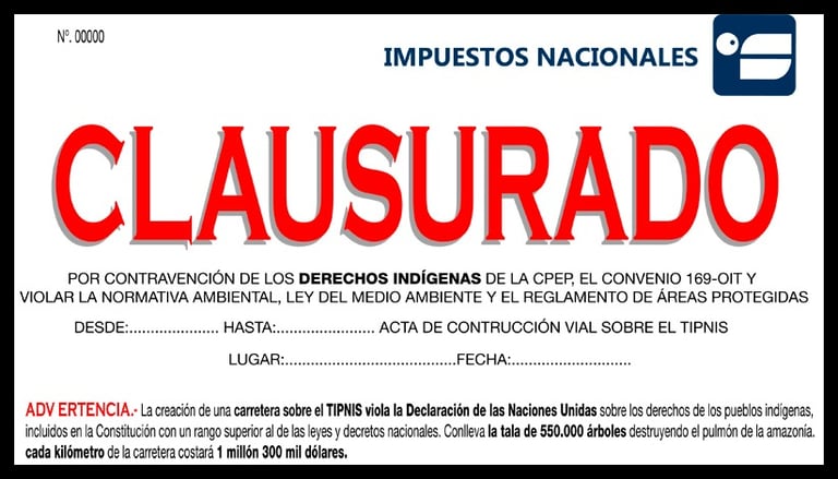 Action in Cochabamba and La Paz (Bolivia) in defense of TIPNIS and rejection of a road construction promoted by the government that will destroy part of the lung in the Amazon, to capitalize on the Indigenous territory and exploit its natural resources. The action consisted the manipulation of the sign "National Tax".