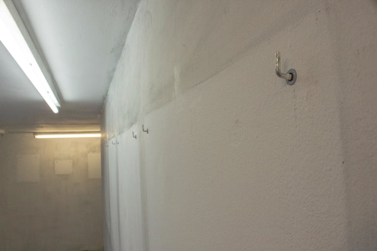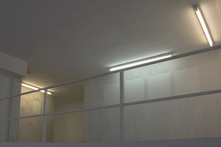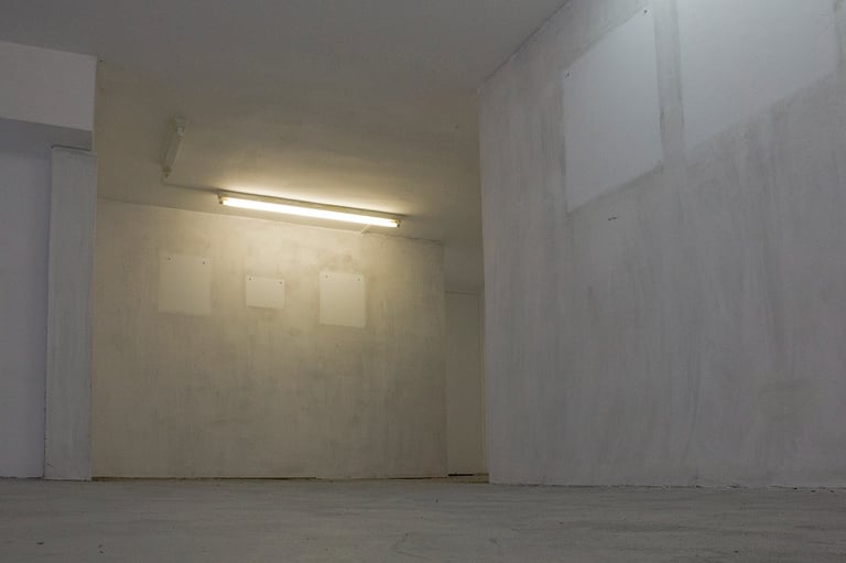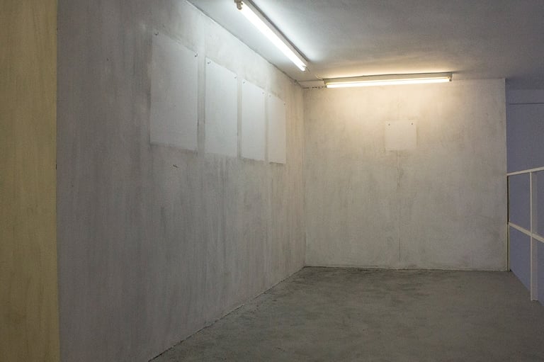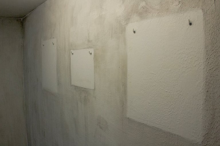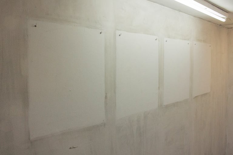 The intervention consisted of placing several canvases on the wall of the room to after staining the wall with the charcoal, creating a stain of dust on the whole room.