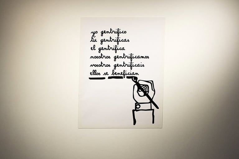 Así, GENTRIFICACIÓN plantea un diálogo que es materializando en a través de intervenciones en el espacio público y de su “presentación oficial” en Espacio Trapézio; pero también es un modo de crear a través de formas reconocibles cuestiones intrínsecas a nuestro imaginario que, en ocasiones, asumimos sin cuestionarnos sus problemáticas originarias. De este modo, DosJotas nos invita a repensar sobre los sistemas de desactivación de contenidos críticos de nuestra sociedad contemporánea.