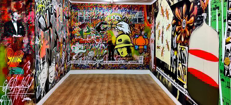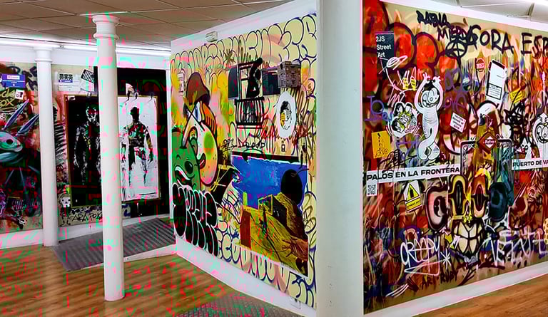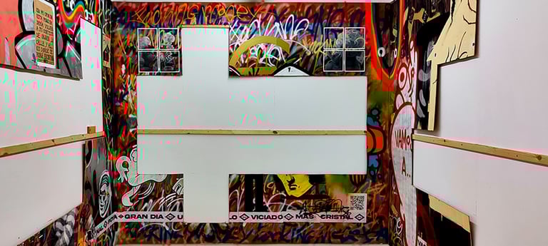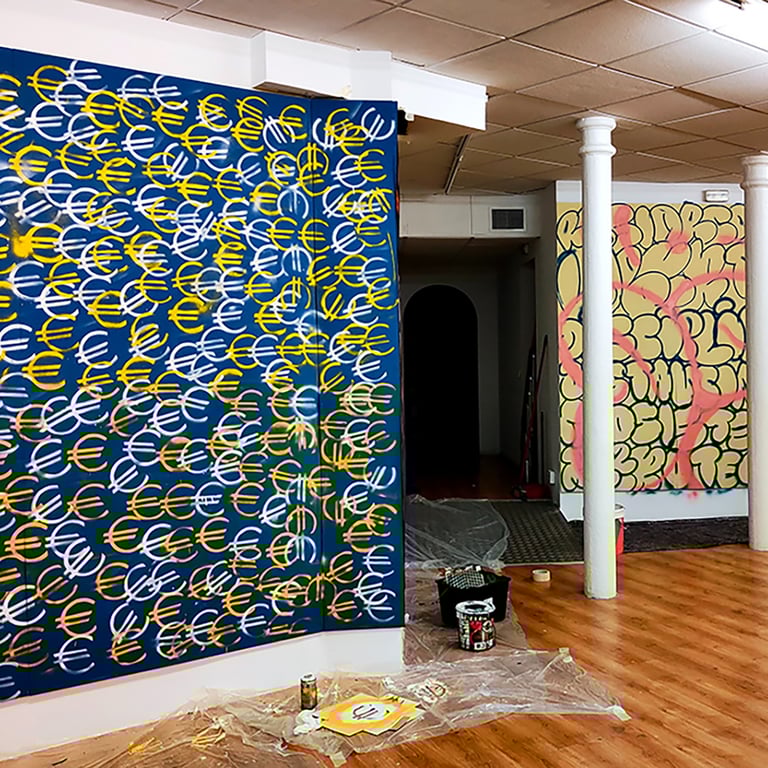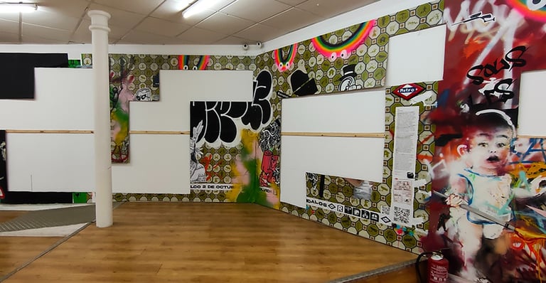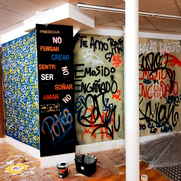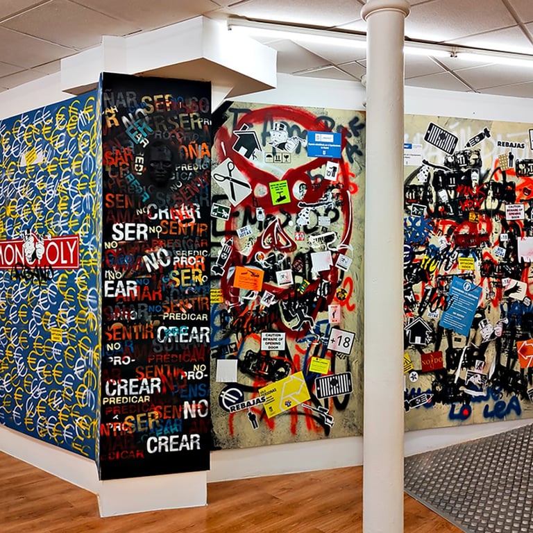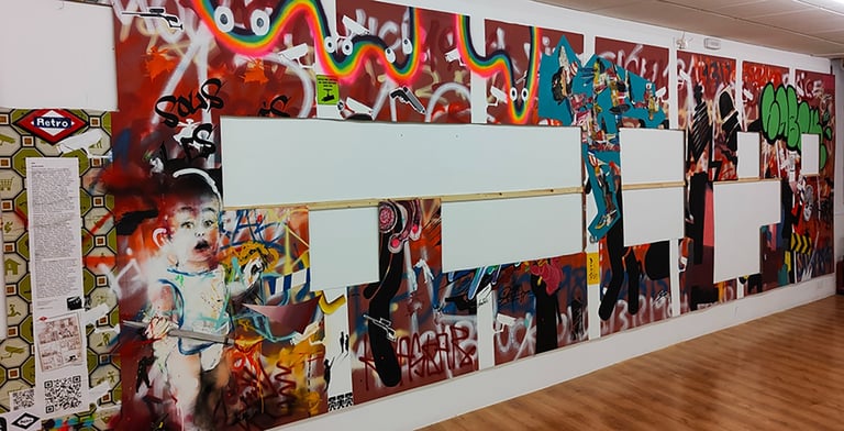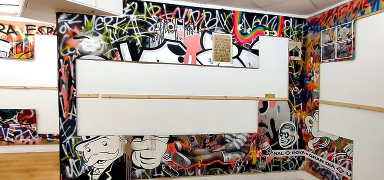 -The second stage began on the day of the inauguration where the project was presented in the room. That day all the walls were intervened by Dosjotas, the 50x50cm spaces went from being worth €75 to €150 on that day alone, the list of artists who later intervened on that first layer painted by Dosjotas was also announced.