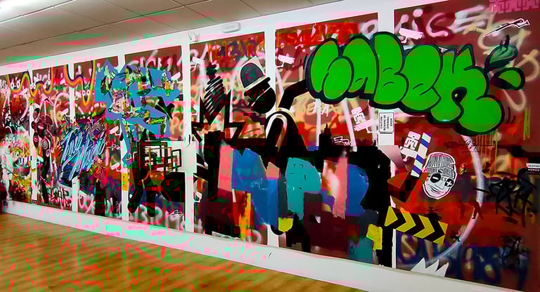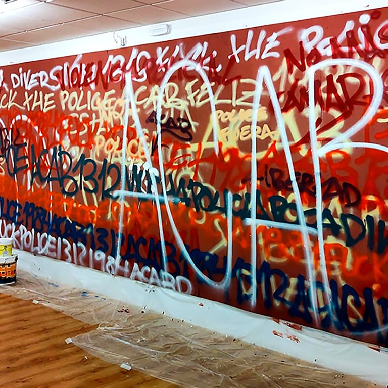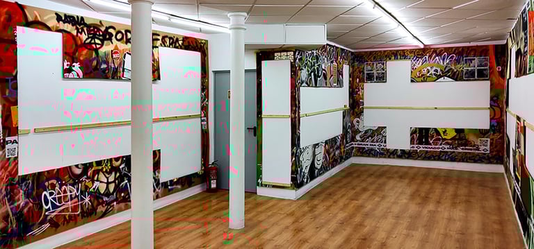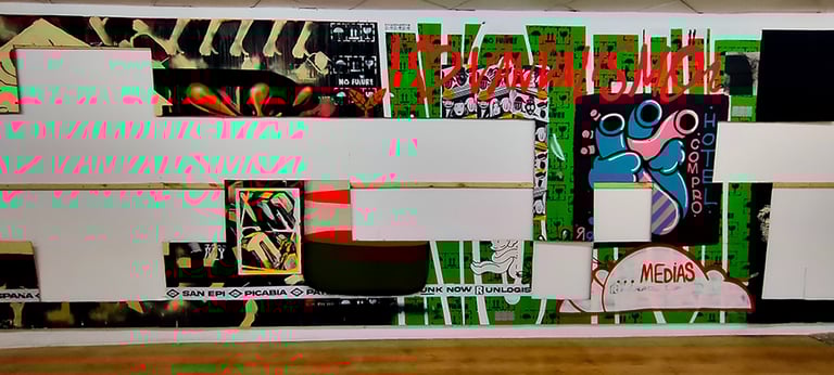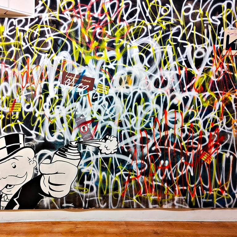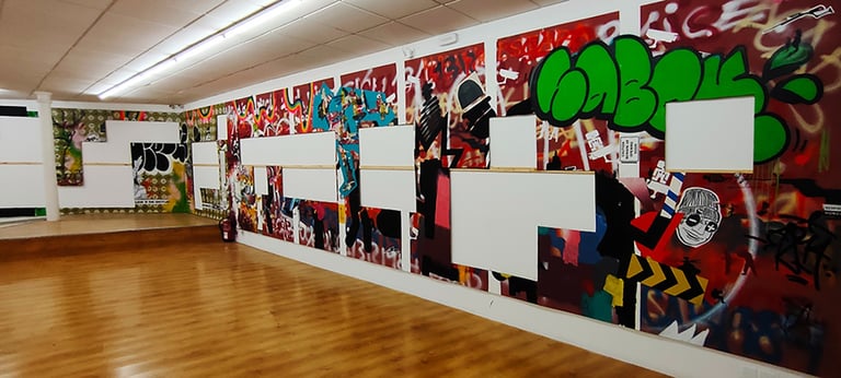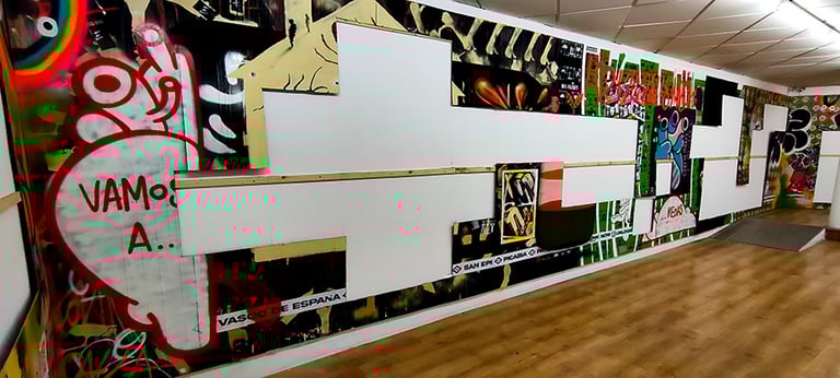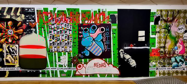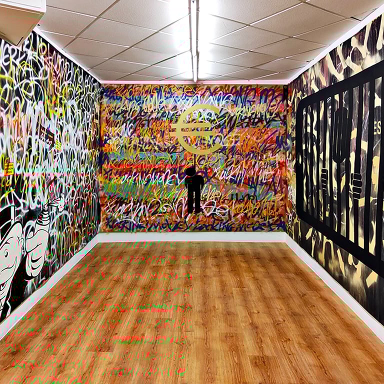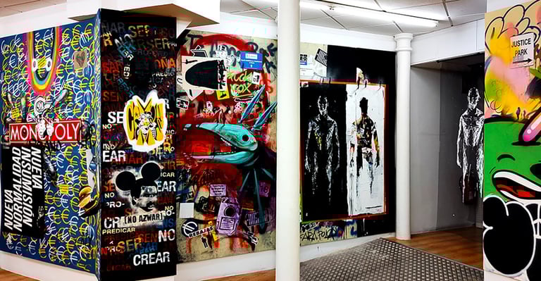 -The second stage began on the day of the inauguration where the project was presented in the room. That day all the walls were intervened by Dosjotas, the 50x50cm spaces went from being worth €75 to €150 on that day alone, the list of artists who later intervened on that first layer painted by Dosjotas was also announced.