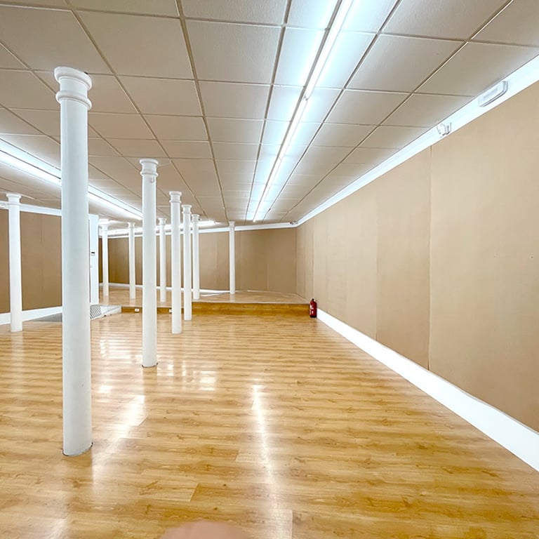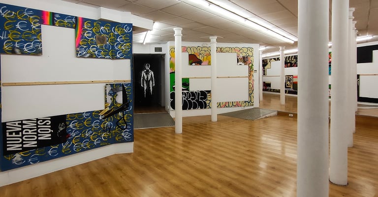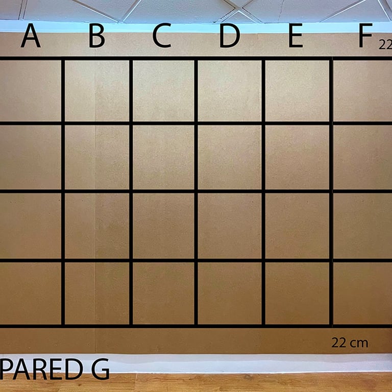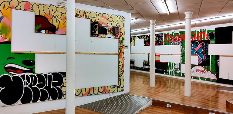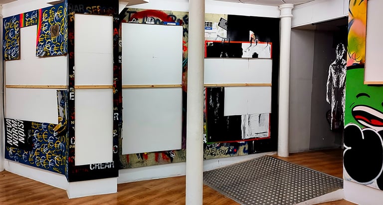-The first stage consisted of making an installation covering all the walls of the gallery, from floor to ceiling, with wooden planks. This surface formed the false walls where the artists intervened. Subsequently, a plan of the gallery walls was generated, delimiting 50x50cm spaces. This plan gave rise to the first phase of commercialization; It was sent via email, it was posted on social networks... putting the works not yet executed on sale; that is to say, each 50x50 cm space was sold off-plan for €75 on the condition of not knowing what was going to happen in that space.