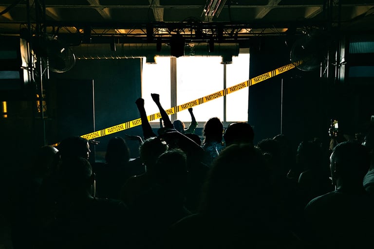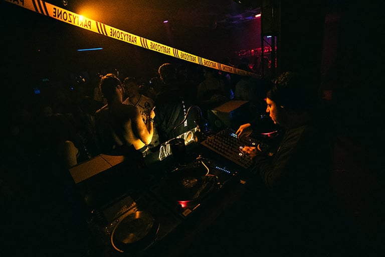 La instalación para “Alqvimia Warehouse” en su IV edición de eventos en localizaciones secretas donde se fusiona la música electrónica y el arte, consistió en colocar por diferentes puntos del espacio una cinta de balizar con la frase “Party zone” haciendo referencia a esos otros modelos alternativos de ocio no regidos por la institución.