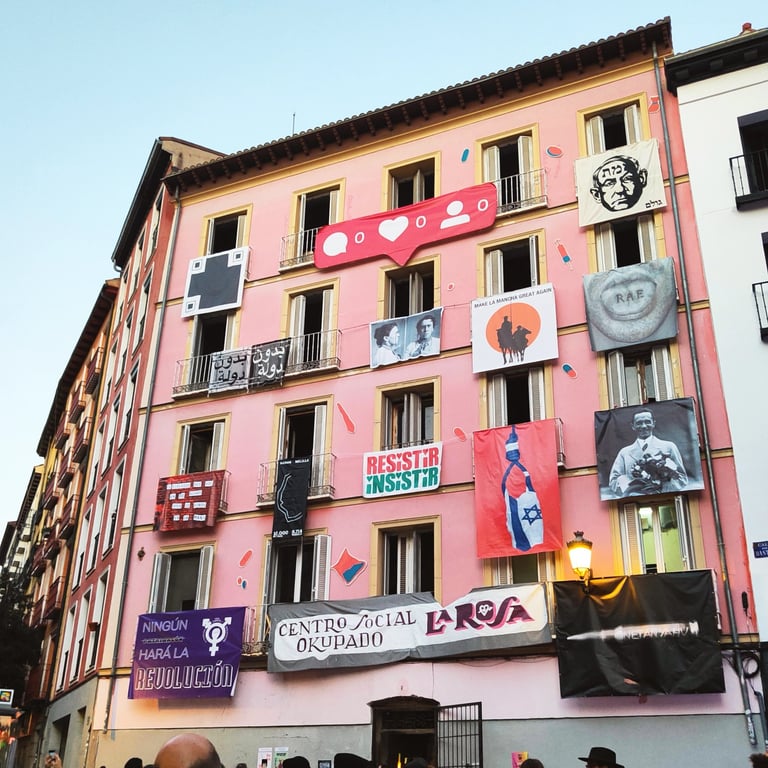 La exposición colectiva tuvo lugar en noviembre de 2024 en la fachada exterior del Centro Social Okupado La Rosa, utilizando los balcones del edificio como espacios expositivos. Cada balcón fue ocupado por un artista o colectivo que reprodujo su obra en formato pancarta. El uso de este soporte como medio de expresión fusiona arte y activismo, creando un acto simbólico de resistencia y creatividad. En esta colectiva, este símbolo clásico de protesta y voz colectiva se reinterpretó como una intervención artística, transformando los balcones del CSO La Rosa en espacios de comunicación y reflexión.